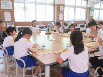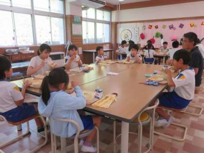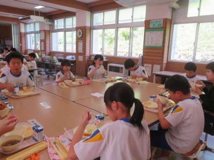 7/19 給食風景 公開日 2024/07/19 更新日 2024/07/19 お知らせ 子どもたちが毎日心待ちにしている給食。明日からしばらくはお休みです。 今日も、いつものようにランチルームに全校が集まり、3つのテーブルに分かれて、楽しく会食しました。