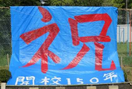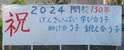 老人クラブ「あすり会」の協賛による手作りの横断幕が、昨日学校に設置されました。一つは学校運動場の東側フェンスに、もう一つは旧飼育小屋のフェンスに掲げてあります。『開校150年記念大蔵学区大運動会』に向けて、子どもたちの気持ちも高まります。