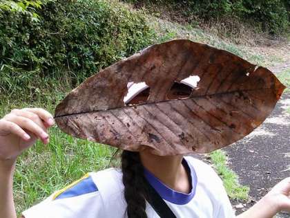 10/7 1・2年 生活科 公開日 2024/10/08 更新日 2024/10/08 特色ある学校づくり推進事業 『秋さがし』で大蔵町の探検に出かけました。どんぐりや栗、松ぼっくりを見付けました。大きな葉っぱに目の穴をあけ、お面を作って遊びました。今日集めた材料は、これから工作に使います。