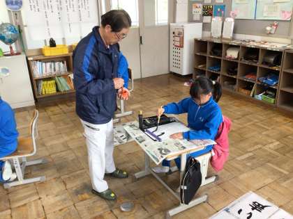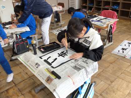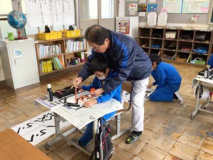 書写の時間 地域講師の方の指導で、書き初めの練習を頑張っています。