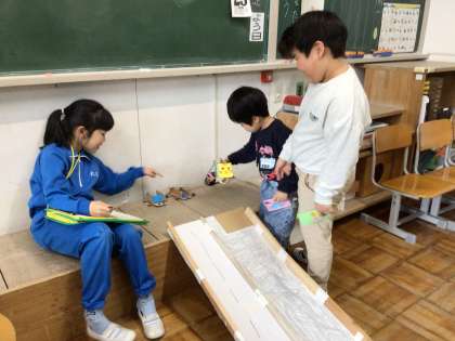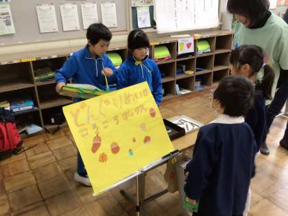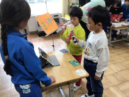 生活科の学習 大蔵こども園との交流会 『あきのあそびらんど』で園児を迎え、楽しく遊ぶことができました。