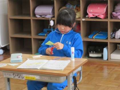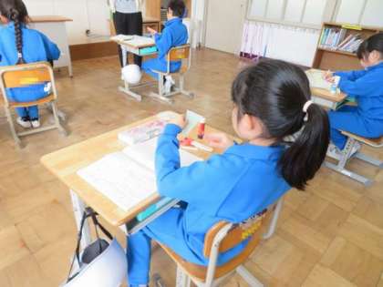 2時間目の算数の時間です。『三角形と四角形』の学習をしています。今日は、三角形を1本の直線で切ったらどんな形ができるかを調べました。