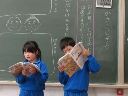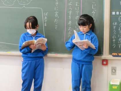 1時間目は国語の授業です。『かさこじぞう』を学習しています。ナレーターのところをチームに分かれて音読しています。