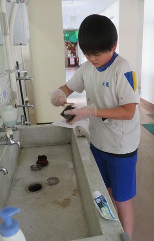 12月13日 掃除の時間 公開日 2024/12/13 更新日 2024/12/13 特別活動 「ピカピカだいさくせん」実行中です。5・6年の子が、家庭科で学習したことを生かして、汚れに合った掃除の仕方を実践したり下学年の子に教えたりしています。