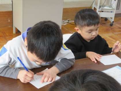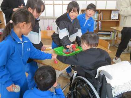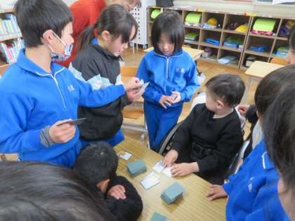 1月23日 1・2年 公開日 2025/01/23 更新日 2025/01/23 各学年から 居住地交流を行いました。1時間目は生活科。『むかしのあそびをたのしもう』というテーマで、「ぼうずめくり」や「お手玉」などの遊びを一緒に楽しみました。2時間目は音楽です。絵描き歌に取り組みました。