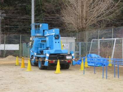運動場のはしにある鉄棒から少し離れたところの電気設備から、遊具の周辺(空中)を通って集会室までの工事になります。カラーコーンで立ち入り禁止区域を示しますので、学校にいらっしゃる際にはご注意ください。
