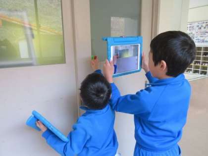 一人一人がすきまちゃんを作り、学校の1階のいろいろなすきまにすきまちゃんを置いてタブレットで撮影し、みんなで鑑賞しました。