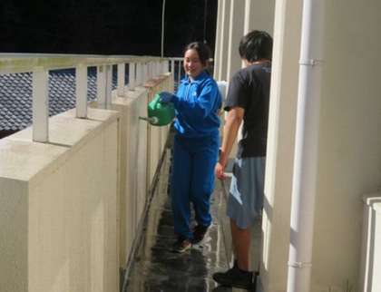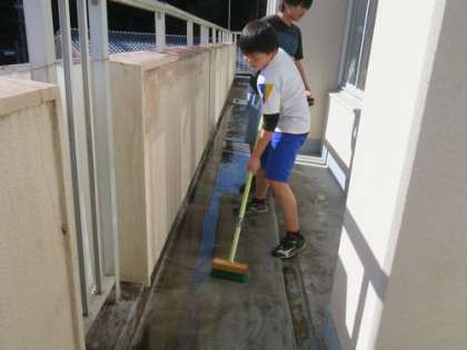 5時間目は「愛校活動」です。2階のベランダをブラシやたわしで磨き、水を流してきれいにしました。