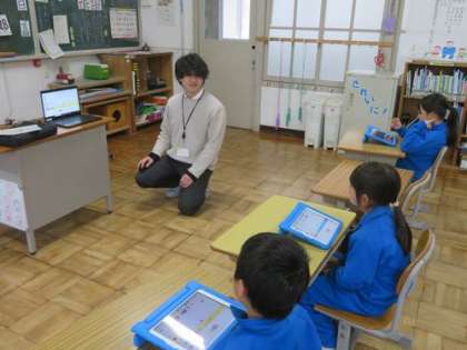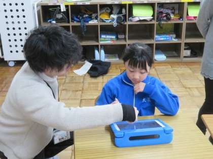 5時間目はICTの時間です。ICT支援員さんと一緒に「Scratch Jr.」で的当てゲームをつくりました。