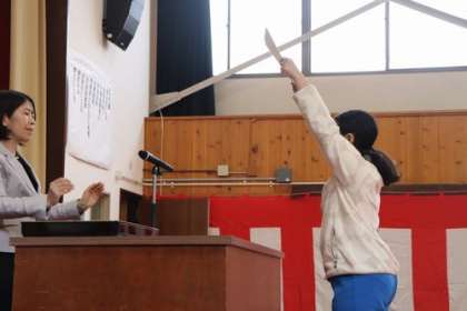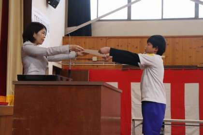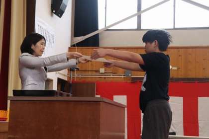 卒業証書授与の場面です。予行練習では、校長先生の代役となった佐々木先生から証書を受け取りました。