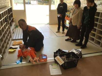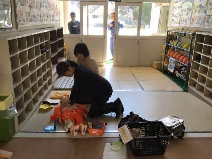 救急車が到着するまで、AEDを使ったり心肺蘇生をしたりします。