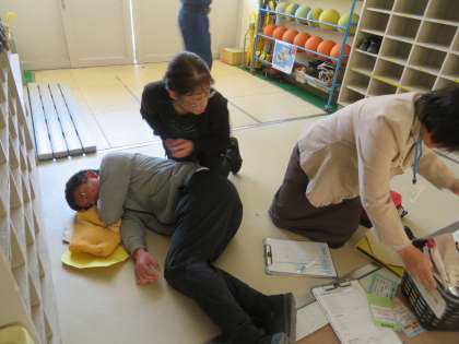 シミュレーション訓練 公開日 2025/04/07 更新日 2025/04/07 お知らせ 今回のシミュレーション訓練で、講師の消防署の方から褒められたのが、患者役の村上先生の演技です。気分が悪くなって倒れ、だんだん病状が悪くなっていく姿を迫真の演技で表現していました。訓練で脈拍を測っても実際に心拍数が上がっていったので、凄かったです。