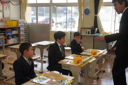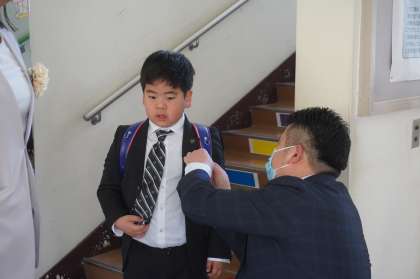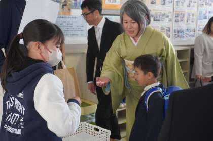お姉さんから胸花をもらい、1年生の教室でお話を聞きます。