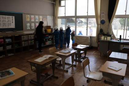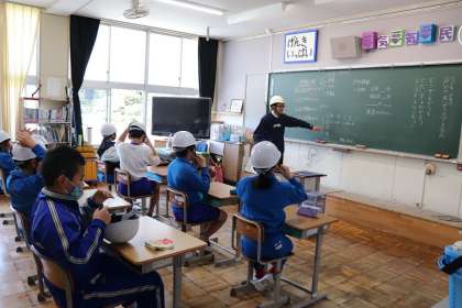 2時間目、各教室で先生から避難の仕方についてや、教室からどう避難するか、経路の確認を行った後、放送の指示に従い運動場に避難しました。