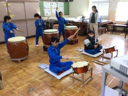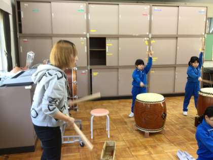 講師の先生のご指導のもと、息を合わせて力強く太鼓を響かせています。