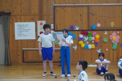 24日の1年生を迎える会のために、前日の23日に集会室でリハーサルが行われました。