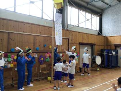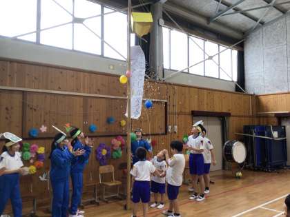 くす玉から垂れ幕や花びらが舞って、盛り上がりました。