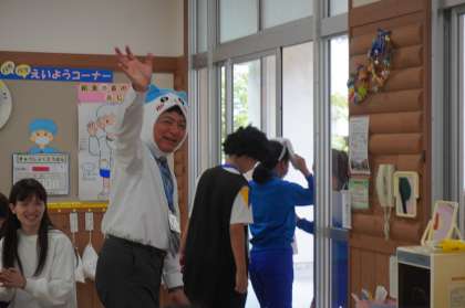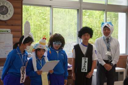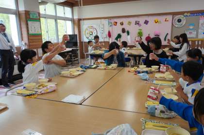 給食の時間、4月5月のt誕生日の人が紹介され、みんなでおめでとうを言いました。