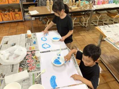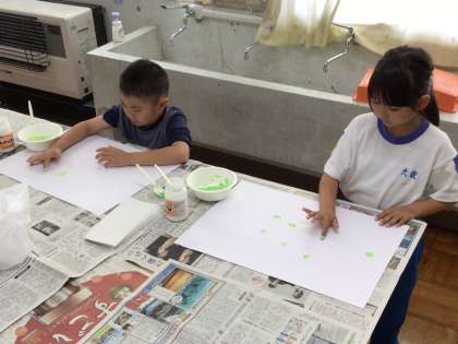 12年生が絵の具を使って、空のイメージを膨らませて、