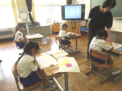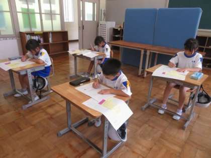 3時間目は国語の時間です。「こんなことしているよ」という作文の学習です。組み立てメモをもとに文章を考えています。
