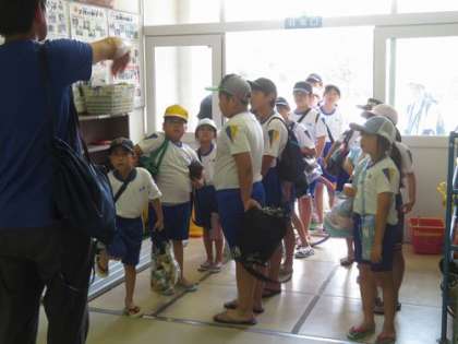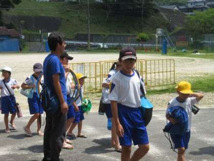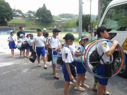 午後から全校でプール学習に出かけます。行先は「足助プール」です。バスに乗り込み、元気に学校を出発しました。