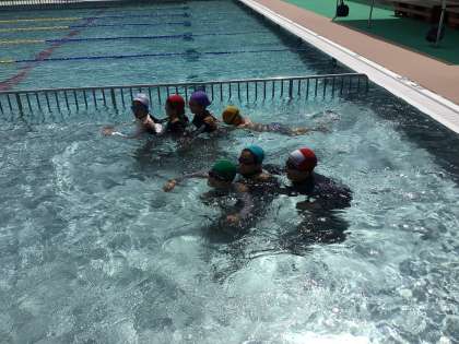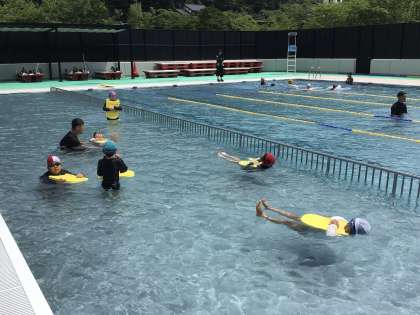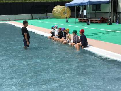 12年生は浅いプールで、水に慣れることや浮くこと、水の中で息を吐く活動などをしました。