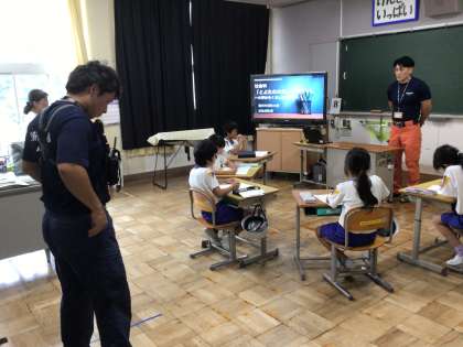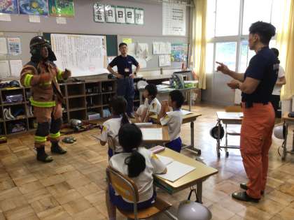 8日、4人の足助消防署職員を招いて、安全な暮らしを支えるために消防士さんがどんな活動をしているかや、家事の原因、防火についてなど、学びました。