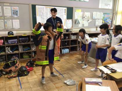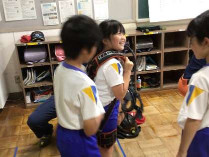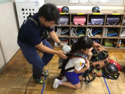 授業では学習だけでなく、防火服を着たり、ボンベを背負ったりする体験活動もできました。