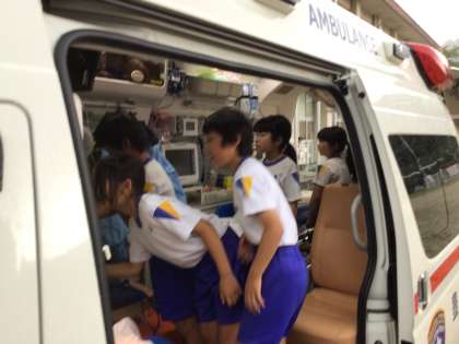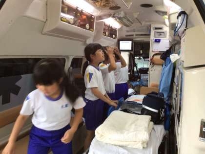 救急車の中を見学したり、ストレッチャーで運ばれる体験もできたりと、普段のじゅぎょうではできない体験をたくさん行うことができました。
