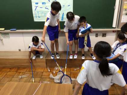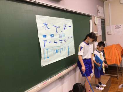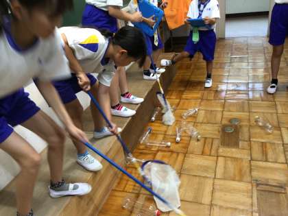 12年生が生活科の夏となかよしで作った水鉄砲を、他の学年の子に使ってもらい、ゲームをするという活動をしました。