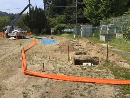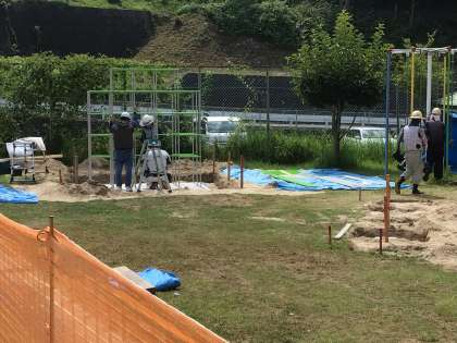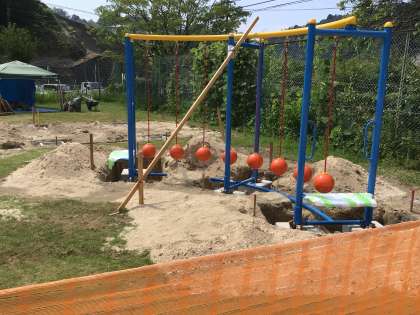 こんなに毎日暑いのに、運動場ではずっと遊具設置のための工事が行われています。