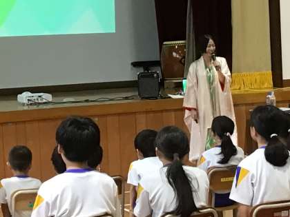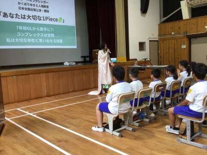 授業参観の3時間目はPTAの研修事業として、ハミングシンガーのかくばりゆきえさんを招いて講演会を行いました。