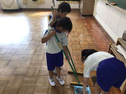 自分の教室ではなく、色別の縦割り班で、上級生が下級生を指示しながら掃除を進めていきます。