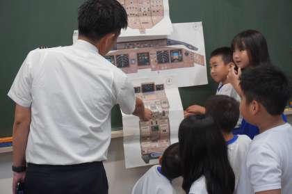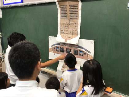 黒板にコックピットの機器が並ぶ図を貼り、それぞれ何を示しているのか、操縦する時どのスイッチなどを操作するかなど、詳しく教えてくださいました。