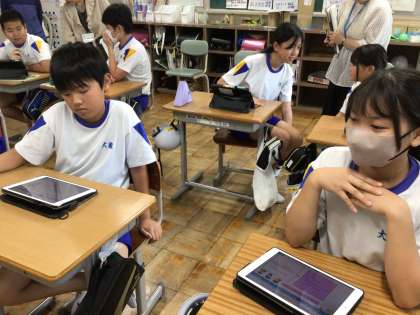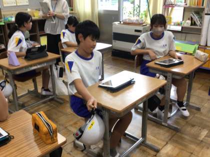 病気の予防のためには、まず病気はどうして起きるのかを知らなければなりません。様々な要因について、子どもたちは自分の意見をタブレットにまとめ、伝え合います。