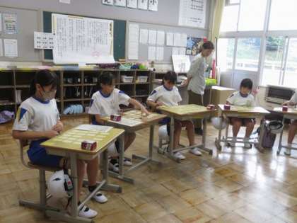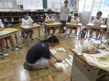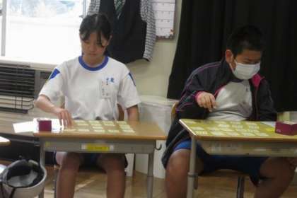 〔百人一首クラブ〕には男子1名、女子5名の計6名が所属しています。第1回目の今日は、競技かるたについて教えていただきました。その後、五色かるたの黄色札だけを並べて札をとる練習をしました。