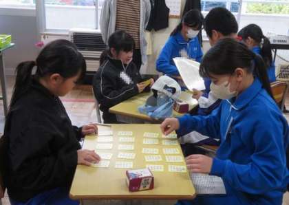 11月10日 クラブ活動〔百人一首〕 公開日 2025/11/10 更新日 2025/11/10 特色ある学校づくり推進事業 後期になって2回目のクラブ活動です。札の枚数をしぼり、二人一組になって競技かるたの形式で対戦をしました。