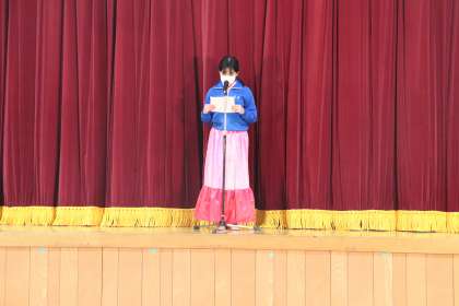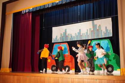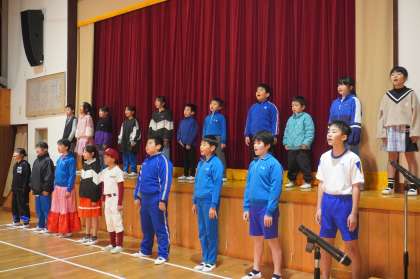 写真は全校合唱、児童代表のことば、最初の1年生の劇の様子です。