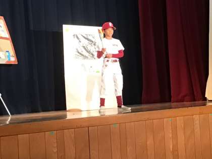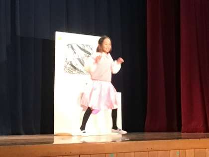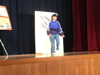 朝起きたら、しっぽが生えていた・・・しかもクラスのこどもたちみんなに。という内容のお話です。一人だけで演じる時間が長く、一人で歌うシーンもありますが、34年生の子は緊張感に耐え、がんばって演じていました。