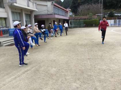 説明の後は、実際に外に出て、陸上トレーニングや石田選手のように肩にハンデがあった状態で走ってみる体験を行いました。