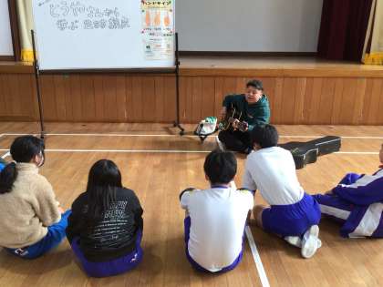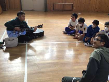 梅村さんが部活動で行っていたバレーボールをみんなで体験したり、梅村さんのこれまでの生き方を語っていただいたり、ミュージシャンだった経験を活かしてこどもたちにギターの弾き語りでオリジナル曲を紹介していただいたりと、様々なことを教えていただきました。