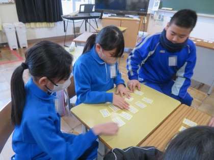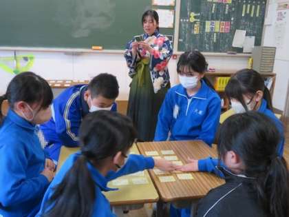 今日は3人1組になって団体戦を行いました。チームごとに作戦をたて、協力して札をとる工夫をしました。お互いに声をかけ合い、楽しみながら活動することができました。袴姿の講師さんを見て、気分は競技会かも・・・。