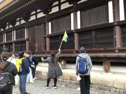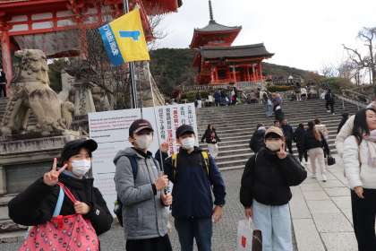 50人乗りバスに児童6名引率6名の12名だけ。なのにバスガイドさんもつくので、団体というよりほとんど家族旅行に近いグループで、ガイドさんの説明も聞きながらの贅沢な時間でした。清水寺ではガイドさんの旗を預かる時間もありました。