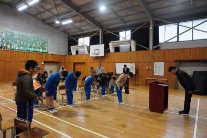 全校朝会では元気に「あけまして おめでとうございます」とあいさつをした後、校長先生から今年の目標についての話を聞きました。