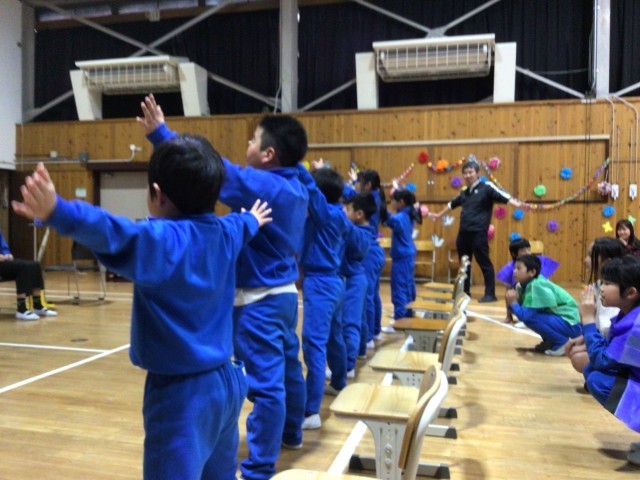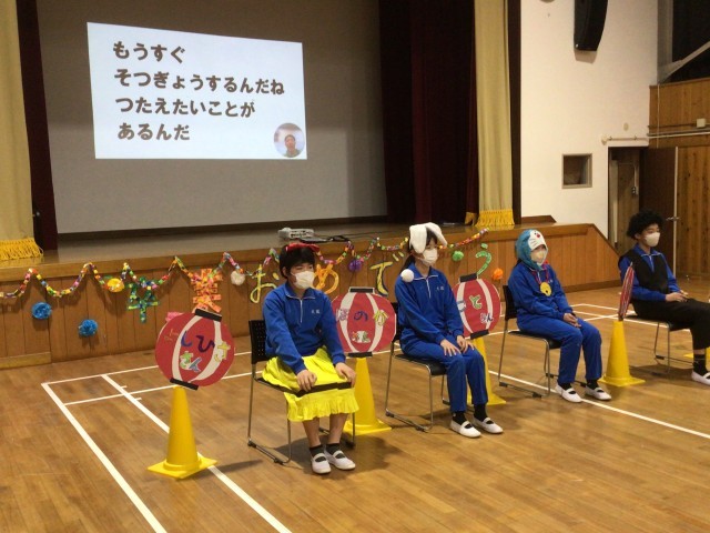各学年の出し物の後、在校生と先生たちから歌のプレゼントをしました。