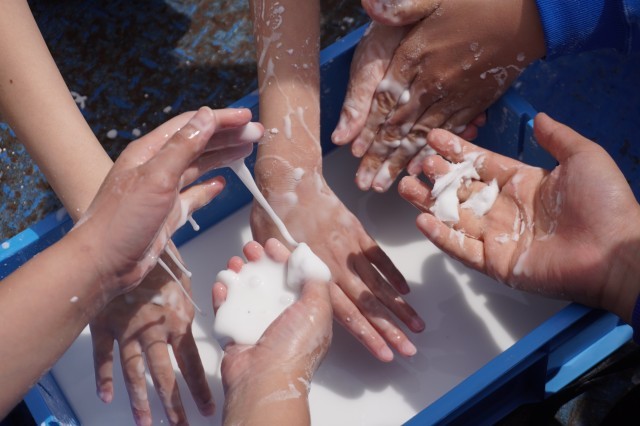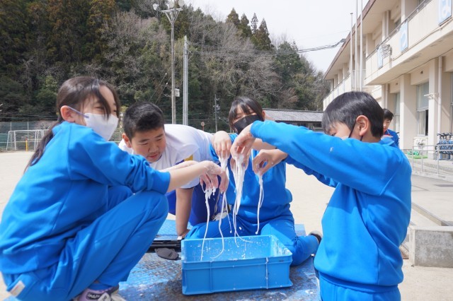 衝撃を加えると固まり、和らげると液体にもどる不思議な「非ニュートン流体」を体験しました。