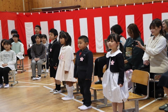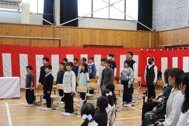 全校児童や保護者、教職員、地域の来賓の皆様など、多くの参加者が見つめる中、1年生たちは元気な声で返事をしたり、良い姿勢で話を聞いたりすることができました。