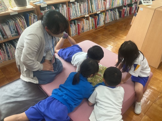 2年生以上が集会室で準備やリハーサルをしている間、1年生の4人は図書室で図書館司書さんや担任の先生と一緒に読書の時間でした。