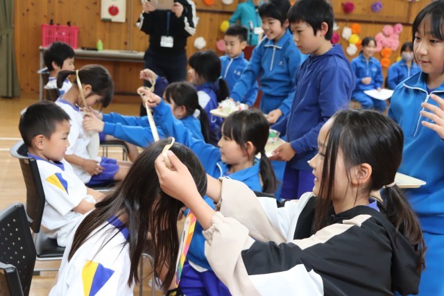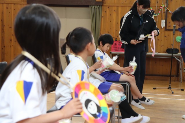 1年生と寺﨑先生へ、34年生から手作りのプレゼントが渡されました。