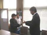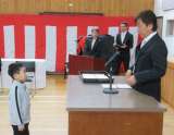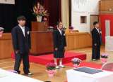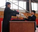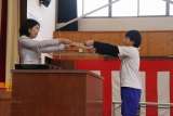 卒業証書授与の場面です。予行練習では、校長先生の代役となった佐々木先生から証書...